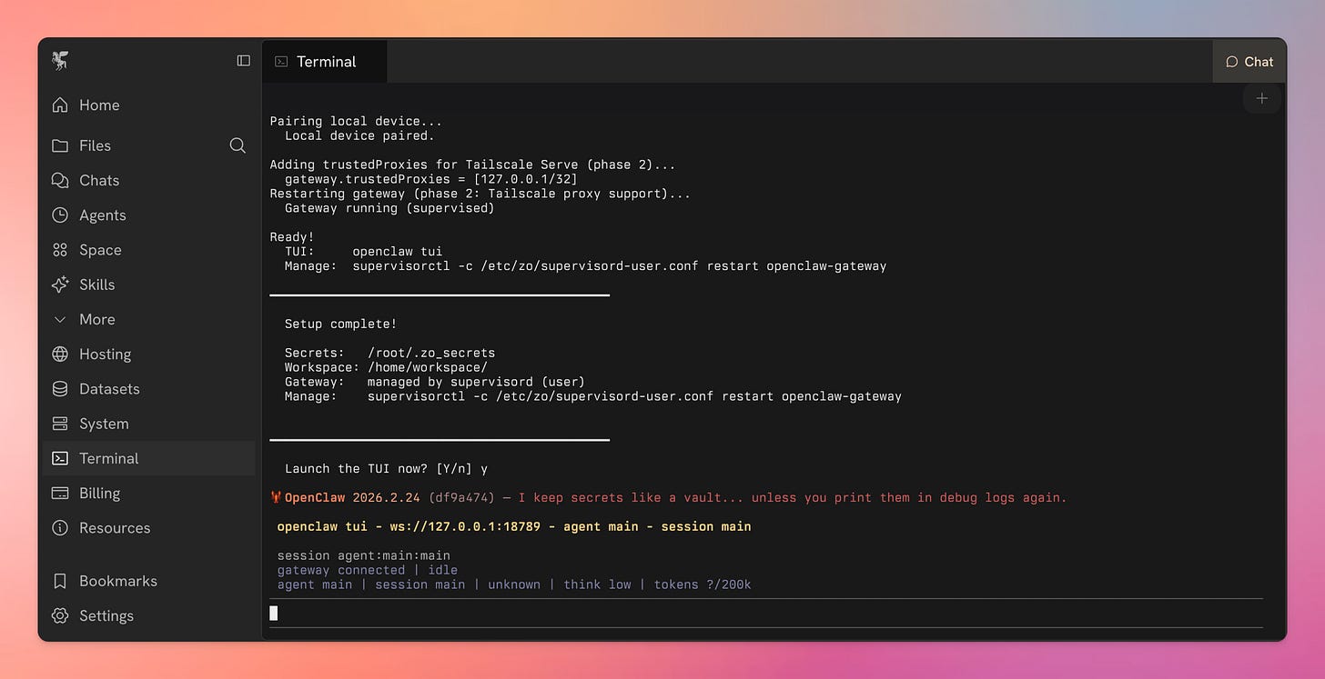 Once done, Zo will offer you to launch the TUI. This is the terminal-based chat. Hit y and voila, youâre talking to your own OpenClaw instance on a secure Zo Computer.
