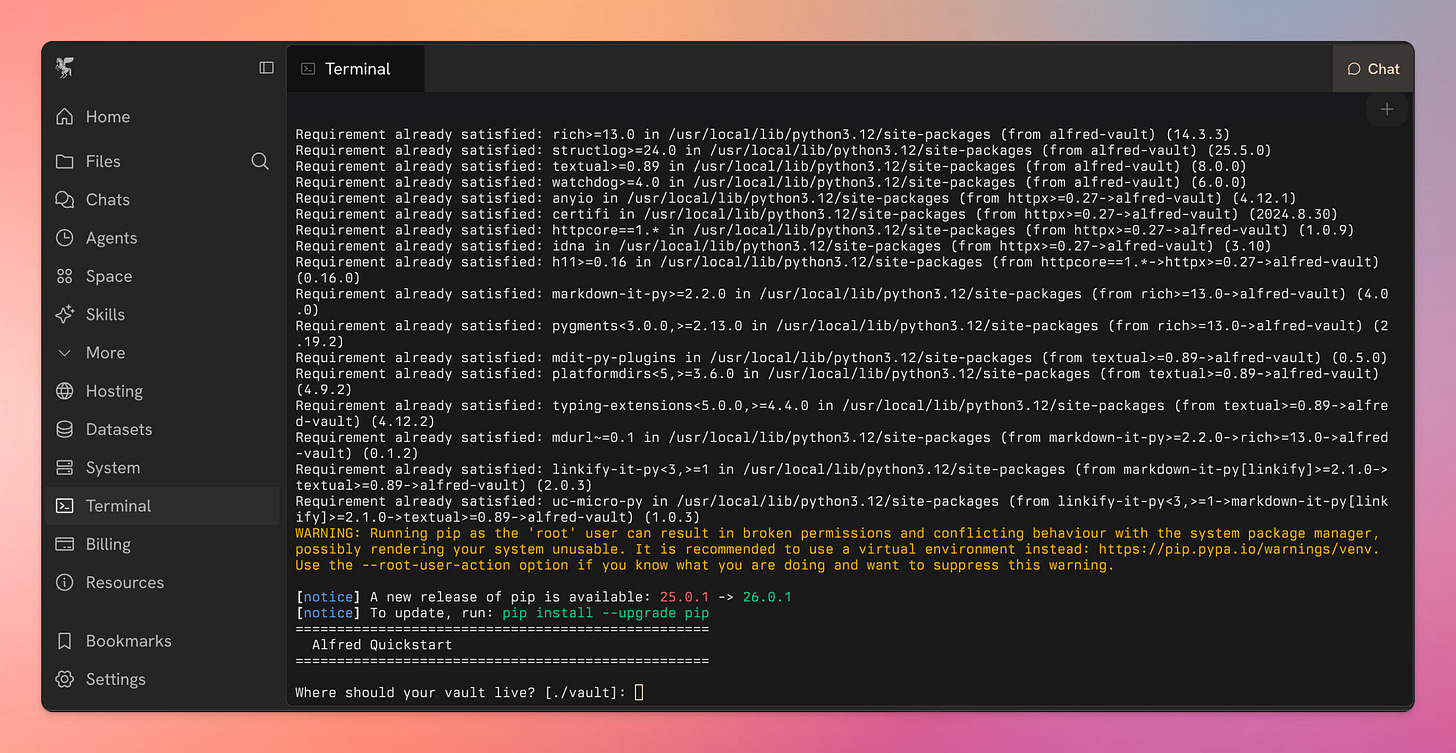 Having the agent runtime is just the beginning. Now we need to install Alfred. This will create the Vault and launch Alfredâs Workers. Alfredâs Workers are the little helpers that will constantly keep building and maintaining your knowledge base.