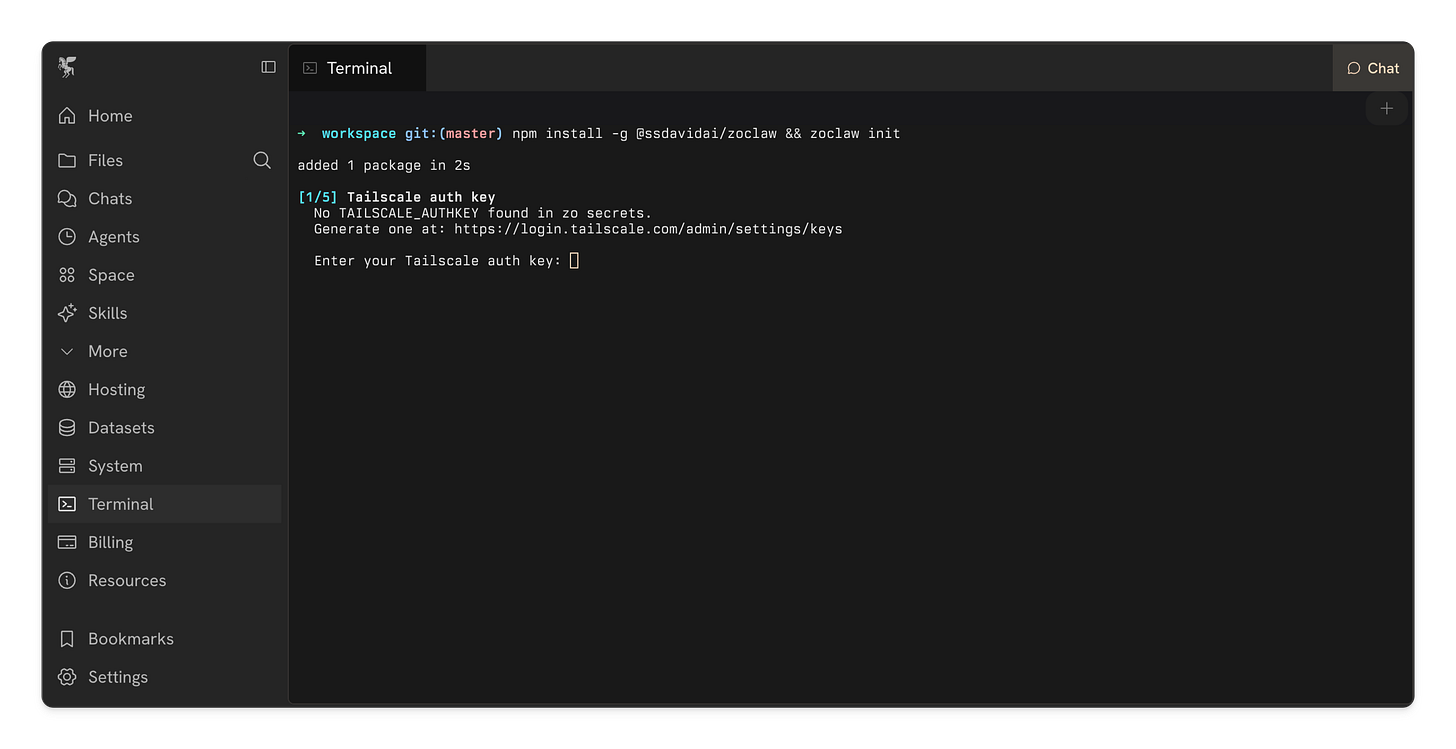 It will install Tailscale on your Zo, set up a private VPN so Alfred is hidden from the public web. This process uses a custom install of a package I wrote specifically for deploying Tailscale on Zo. You can find the repository here.
