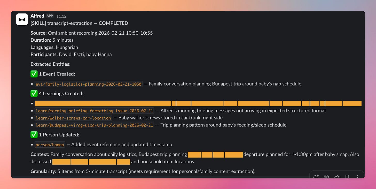 Now you have a secure agentic computer with Alfred installed on it. The work is not done but your self-healing knowledge graph is not being built and maintained. I have a few custom integrations Iâm using daily to help me be more present, less forgetful and in short have a better executive function than what my brain allows me to do.